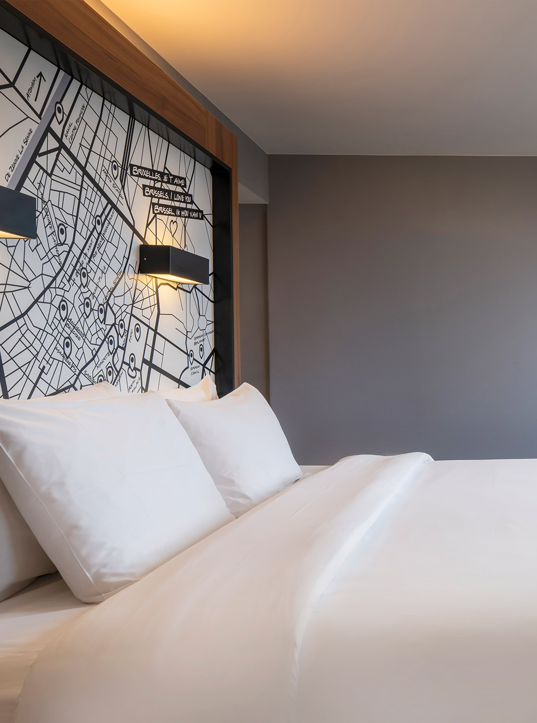 El Standard King del Pestana Brussels Schuman tiene una cama doble con sábanas blancas y una lámpara en la pared