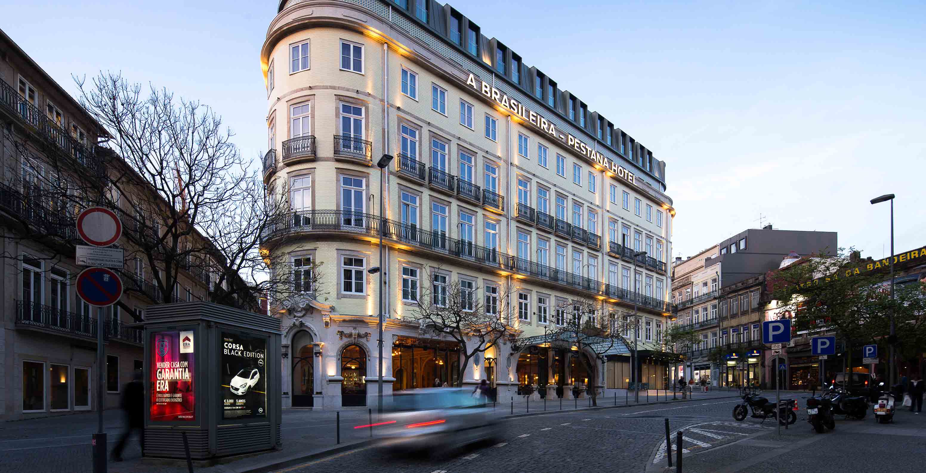 La fachada iluminada del hotel Pestana Porto - A Brasileira exhibe una arquitectura imponente con detalles clásicos
