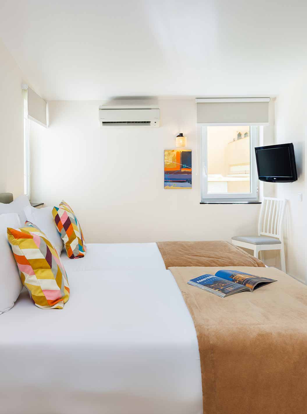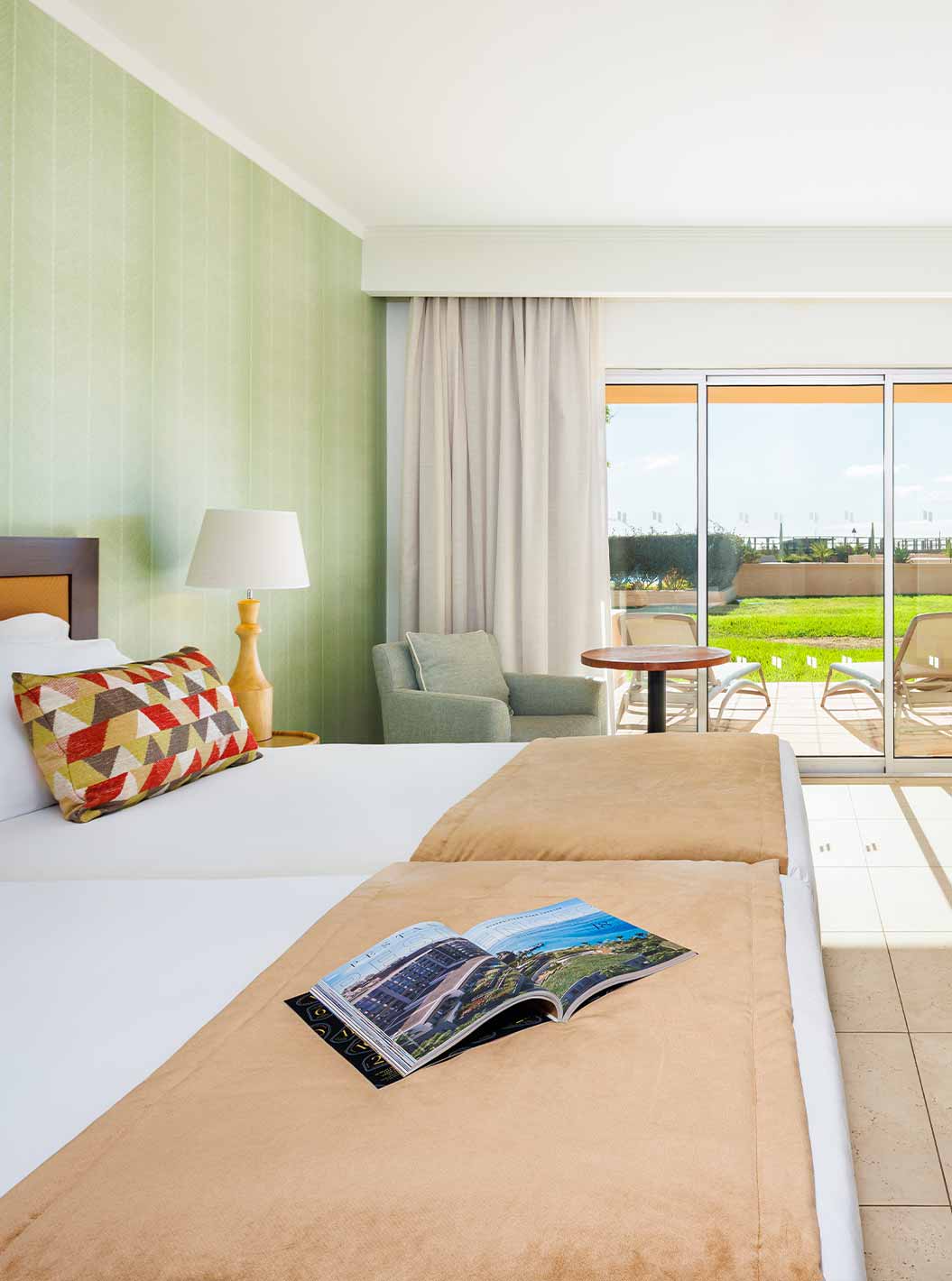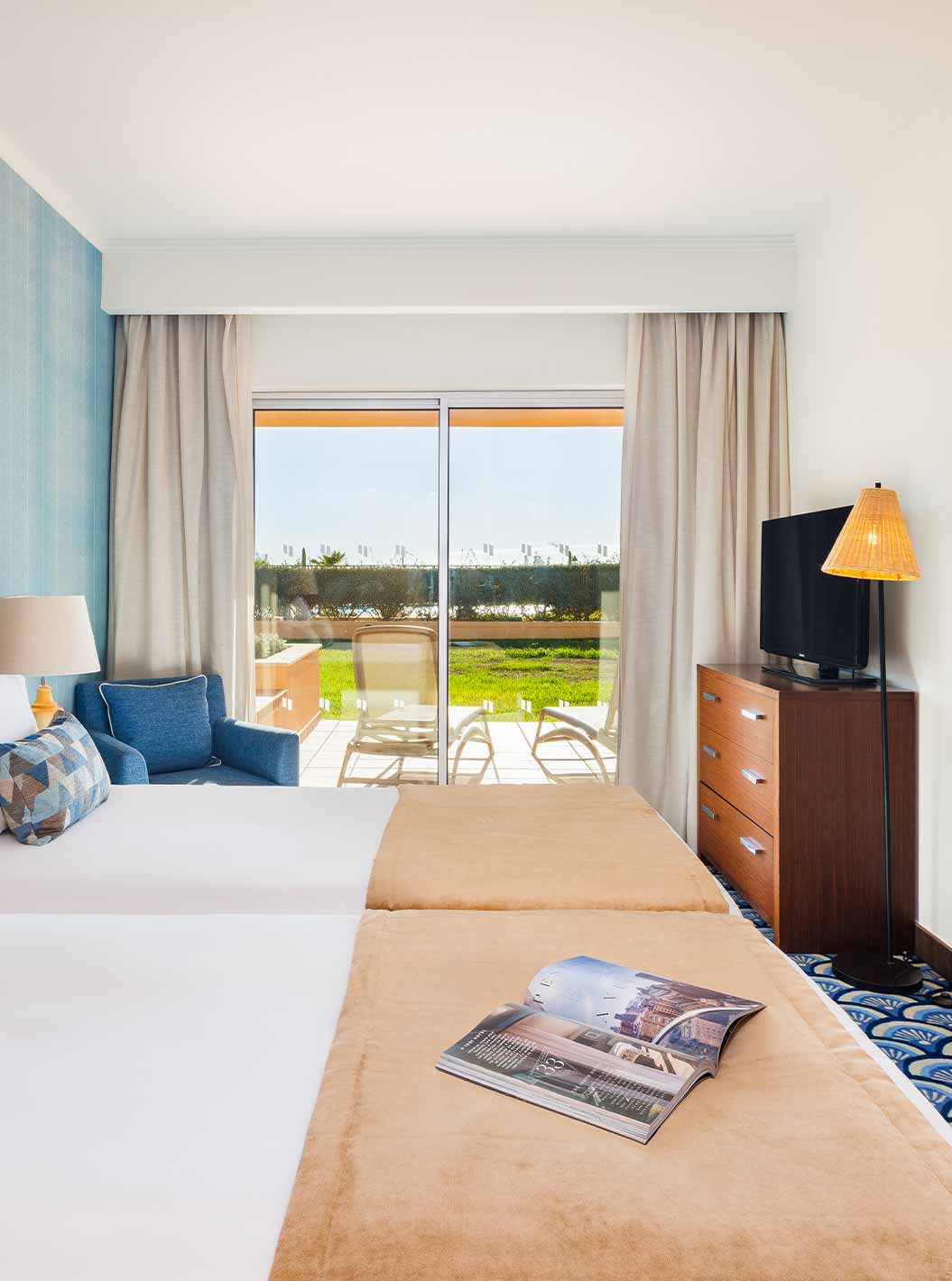 A Villa 3 Quartos Premium Vista Mar do Pestana Alvor Beach Villas tem um quarto com duas camas, janela e ar condicionado