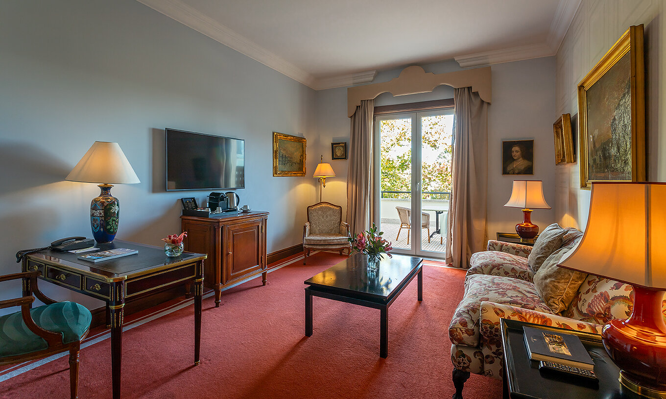 A Suite Collection do Pestana Palace Lisboa tem uma sala com sofá, televisão, janela com acesso à varanda e quadros na parede