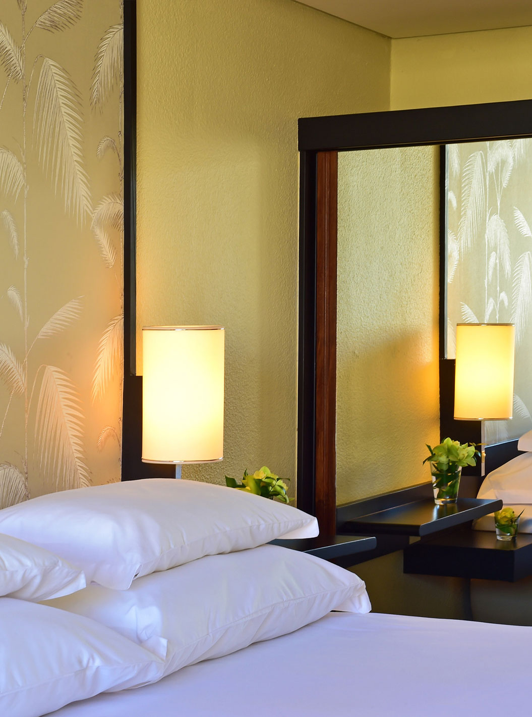 De Presidentiële Suite van Pestana Casino Park heeft een tweepersoonsbed met glas naar de badkamer en behang