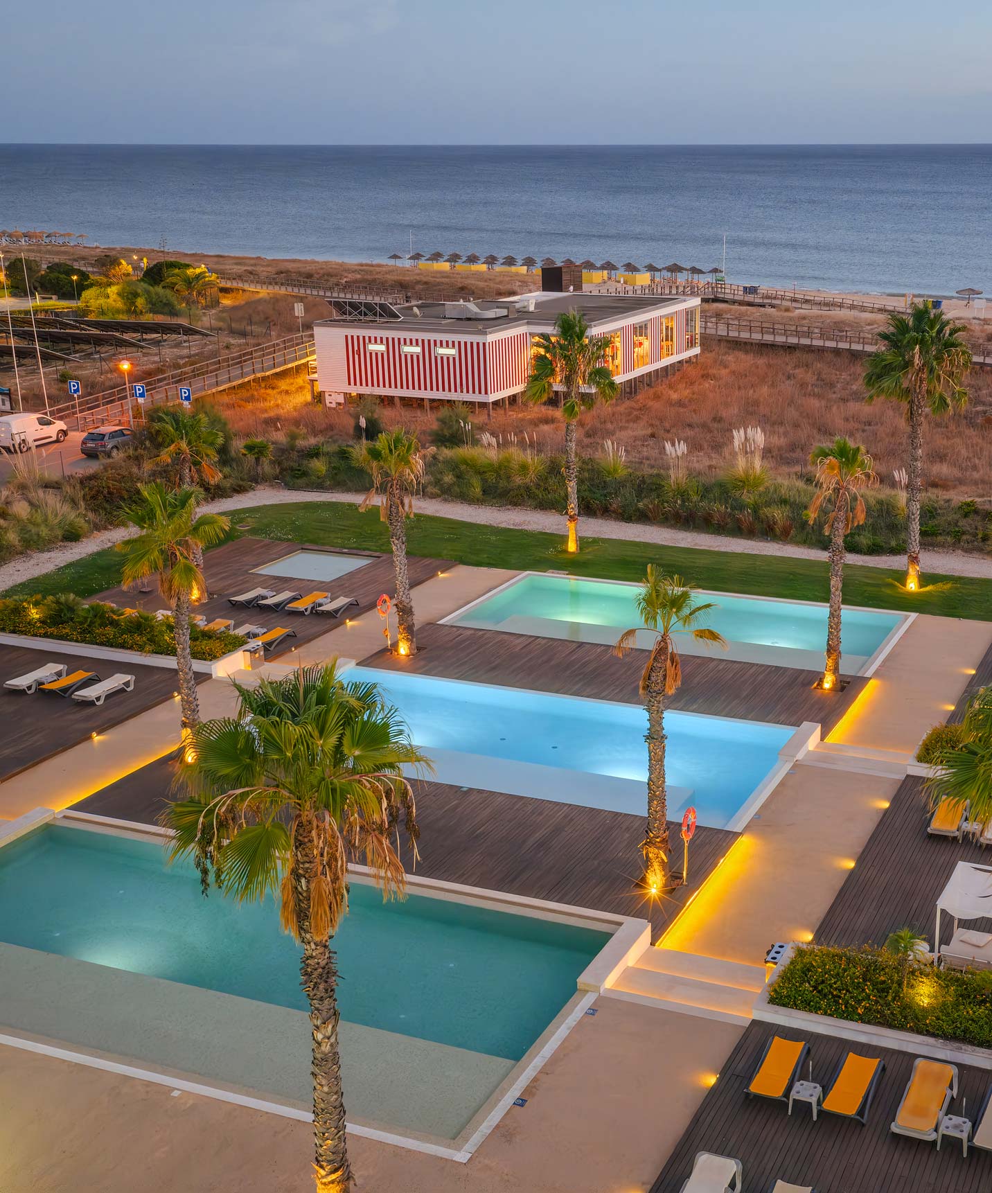 Outdoor area of the pools and sun loungers at Pestana Alvor South Beach, with direct access to the beach
