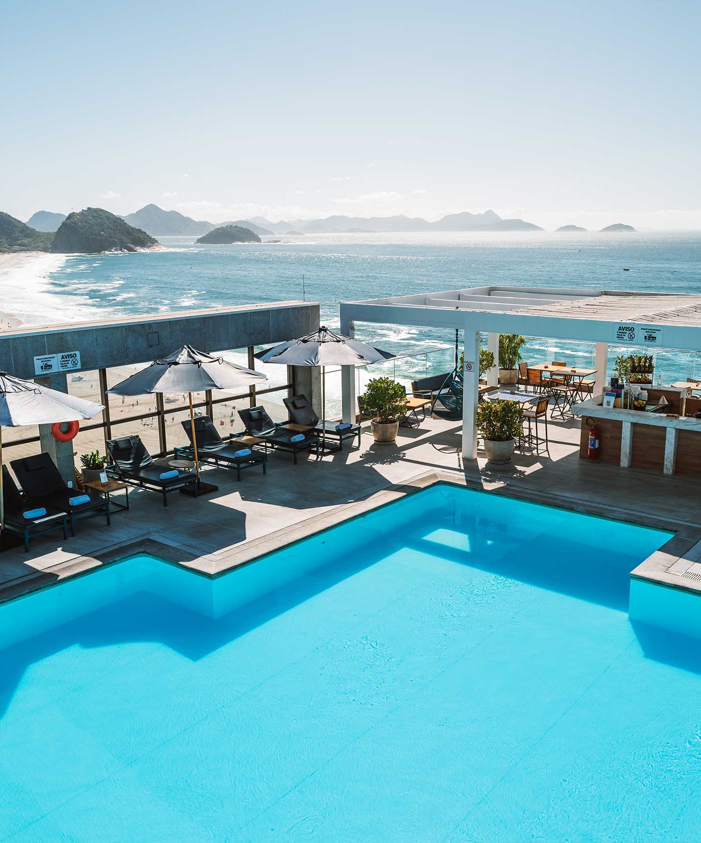 Rooftop of a 4-star hotel in Rio de Janeiro, with sun loungers with towels and a view of Copacabana Beach